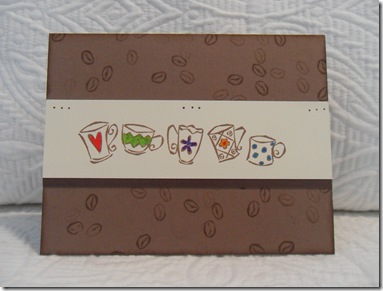 The next time you create a card, try a monochromatic card and accent with very small amounts of color. It really highlights the area with color! Another great tip is to add piercing with your needle tool to create a border. I had planned on punching a scallop trim border along the top, but realized I had not done so AFTER I had attached it to the card. Rather than risk pulling it off, I decided some piercing might do the trick. I like it. Again, the attention is all on the stamped colored cups.